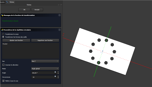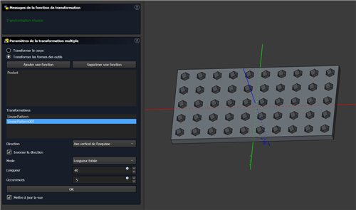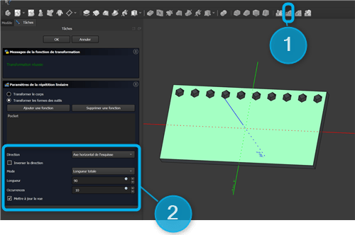 En appliquant une répétition linéaire sur le pocket généré (1), on arrive sur la fenêtre ci-dessous :