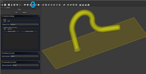 Imaginons le problème suivant : nous avons créé un tuyau suivant une courbe. Ceci est facile à faire sous FreeCAD : on commence par créer une trajectoire et un profil (sur un plan perpendiculaire à une extrémité de la trajectoire) .