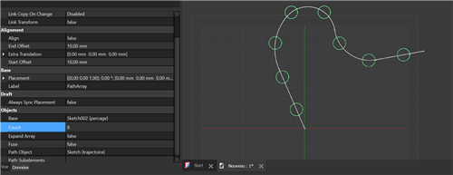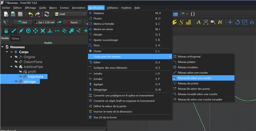 Je passe ensuite dans l’atelier Draft. Après avoir sélectionné le perçage et la trajectoire, je génère un « Réseau lié selon une courbe ».