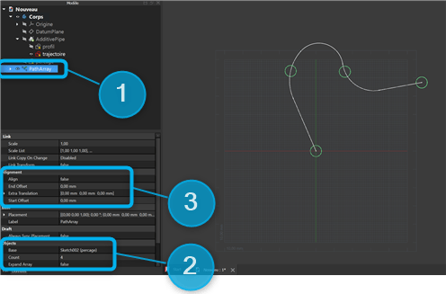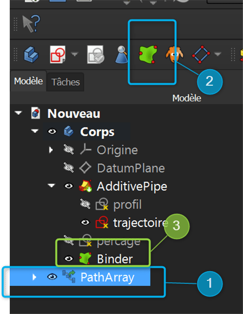 C’est très simple : il suffit de sélectionner le PathArray (1) , de cliquer sur l’icone (2). On obtiens dans le corps actif un objet Binder (3) qui est parfaitement manipulable.