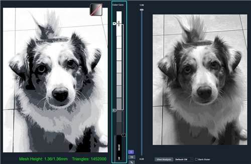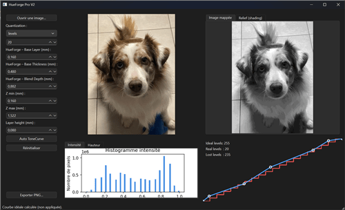 En partant sur une impression avec une hauteur de couche de 0.08, la dynamique obtenue me permet de n’avoir que 20 niveaux de gris « utiles » (moins je perds en détails, plus n’apporte rien et ralonge la durée d’impression). Il suffit d’exporter l’image en png et de l’ouvrir dans HueForge, en reportant les 3 paramètres de Base obtenus.